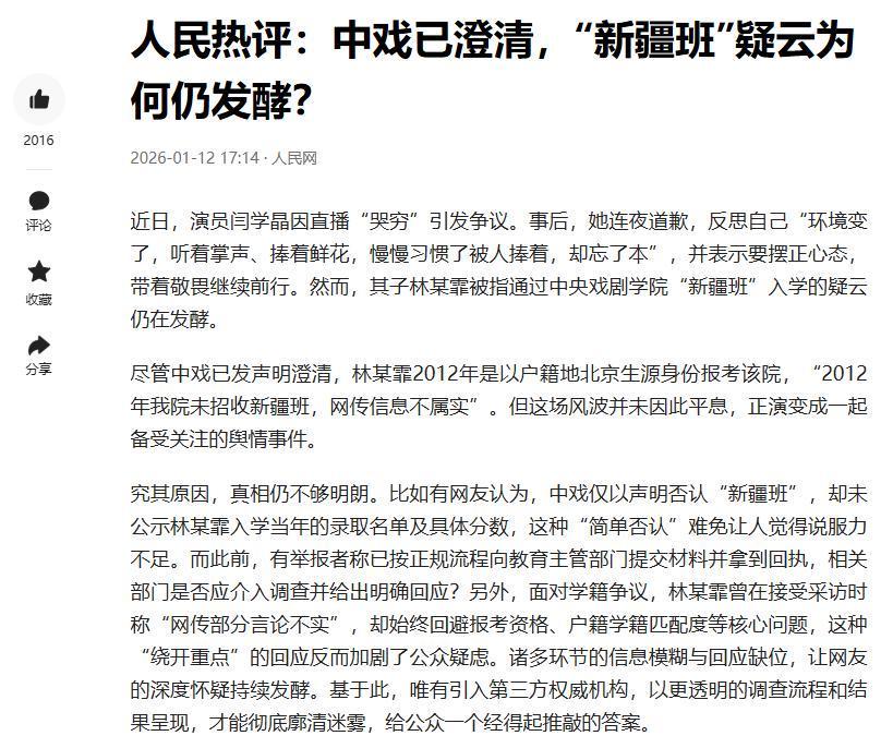 1月12日下午,也就是中戏回应的第二天,人民网更新了一篇文章,谈到的内容就是近期大家热议的林傲霏学历问题!
